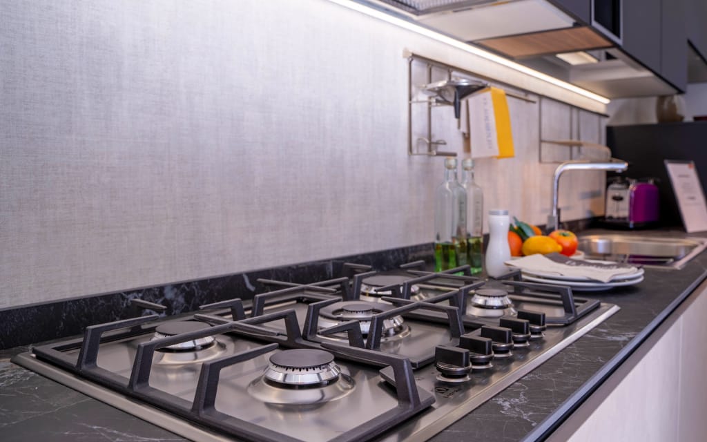 First Γ¨ la cucina che sposa uno stile di vita informale, di qualitΓ , in cui la casa Γ¨ un luogo organizzato, ma anche aperto e fluido. Per questa cucina abbiamo uno sviluppo di 4,50 m, con unici elementi divisibili rappresentati dalle colonne di 1,50 m, mentre il piano in ceramica, illuminato da led, misura 3,00 m.