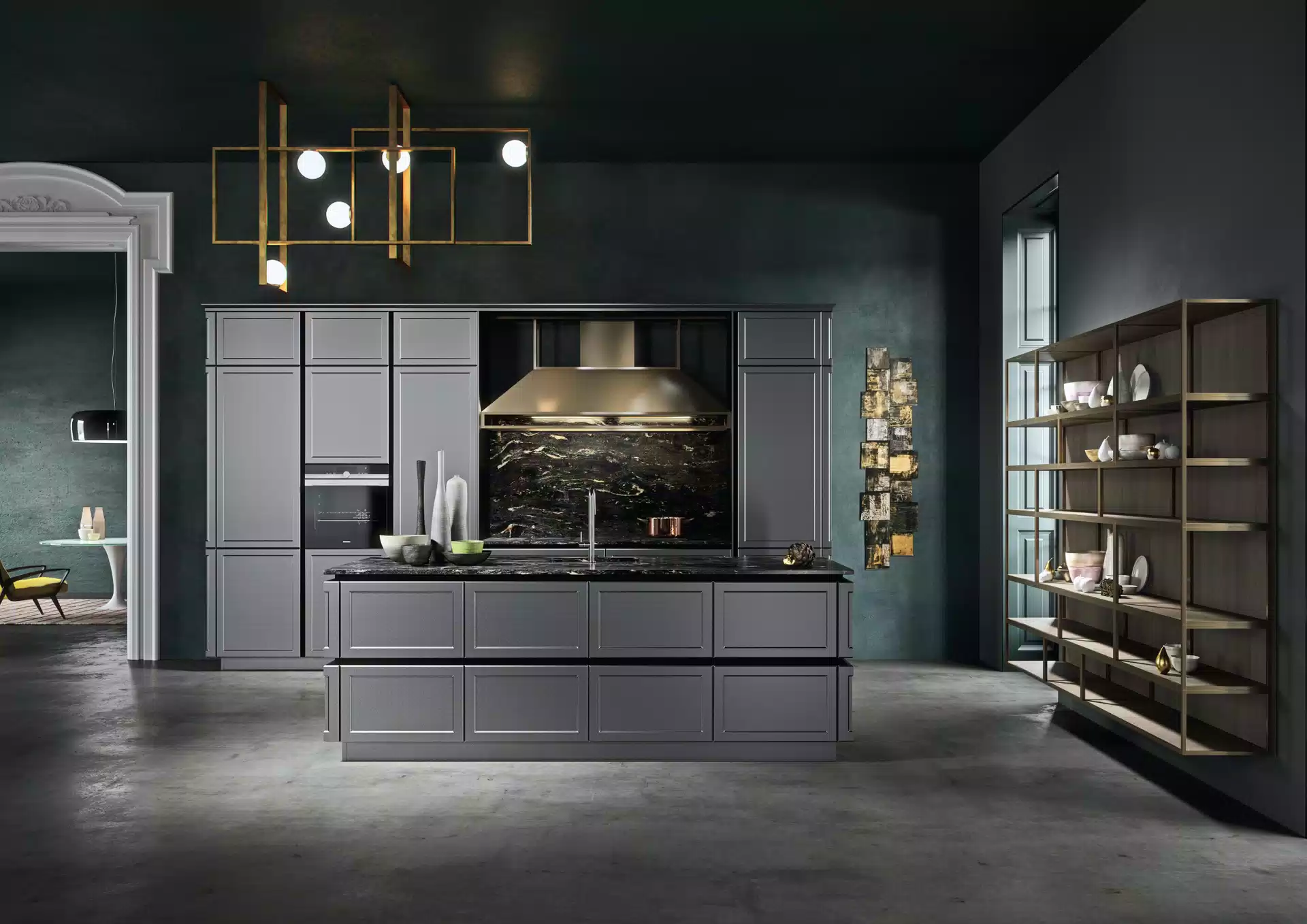 Elementi metallici, disponibili in diverse finiture, come bronzo, acciaio inossidabile e peltro, caratterizzano funzionalmente ed esteticamente il design, apparendo in punti precisi fra mobili pensili, armadi e isola, oltre a fungere da elementi living indipendenti.